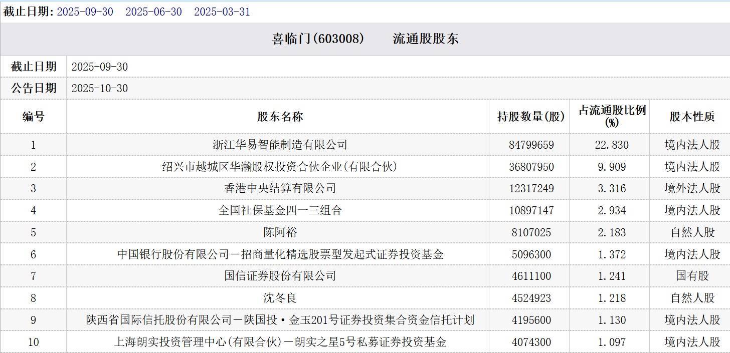 截至2025年9月30日,喜临门(603008)前十大流通股股东中,第六大流通股股东为中国银行股份有限公司-招商量化精选股票型发起式证券投资基金,持股509.63万股,占流通股比例1.372%。